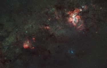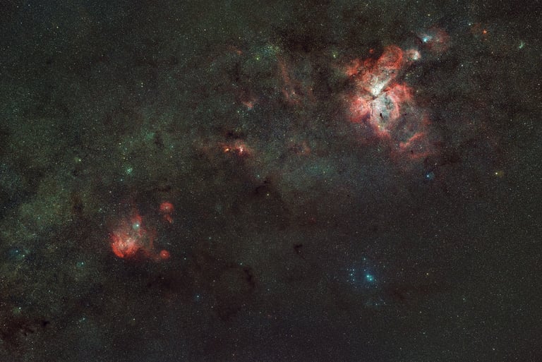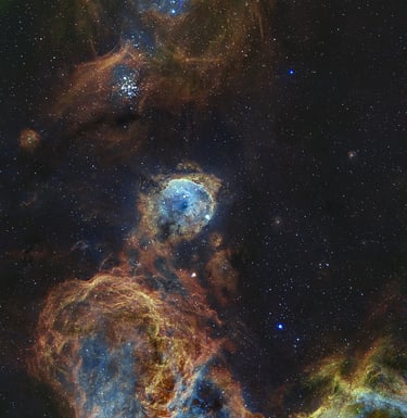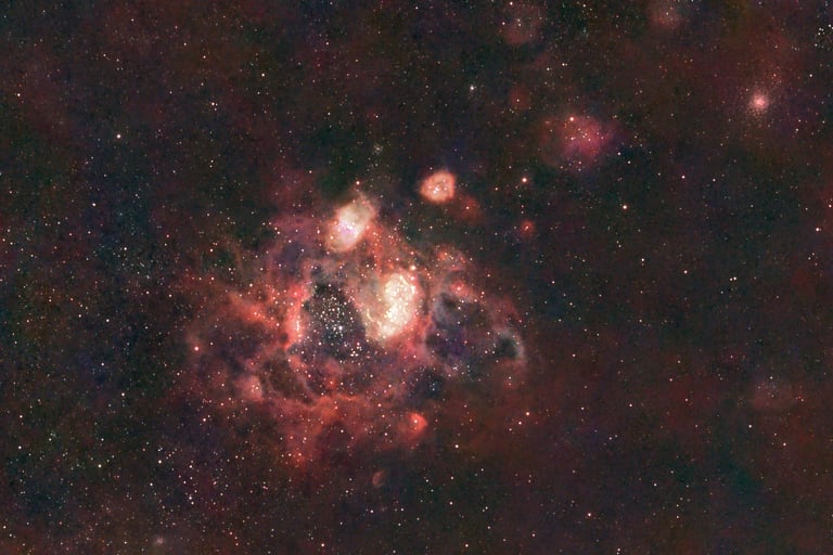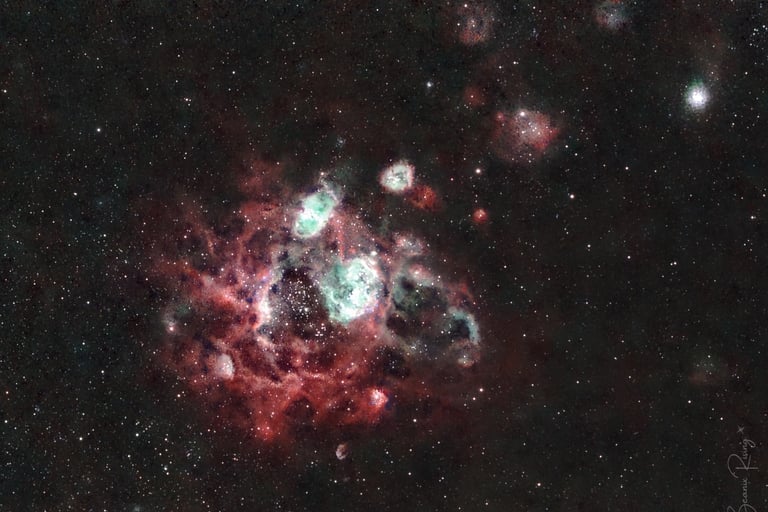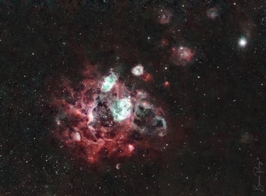 Data collected dec 24 - Feb 25 I participated in a project with some other members of the Astronomical Society of Victoria where we combined out=r data of the LMC. More than 10 different scopes (SCTs, refractors and camera lenses) and ten different cameras were used to produce this dataset. Here is my interpretation of the combined data, featuring the Tarantula Nebula, The Cosmic Reef and many other nebulae in that area. This is the Ha (262hrs) & OIII (259hrs) data presented in Forax/Hoo palette. This is also my first foray processing images with PixInsight so still much to be learnt there.