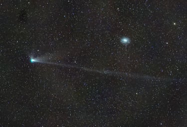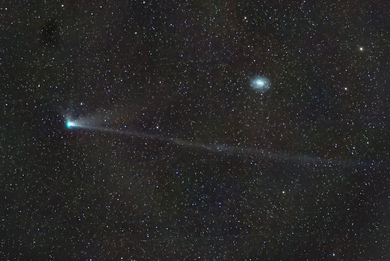 NGC 300 is a beautiful, nearly face-on spiral galaxy located in the constellation Sculptor. It lies about 6 million light-years away, making it one of our relatively close galactic neighbours and a member of the Sculptor Group. This comet likes to share the limelight, NGC 300 is about the 6th bright galaxy in the Grus-Sculptor region to be photo-bombed by it!